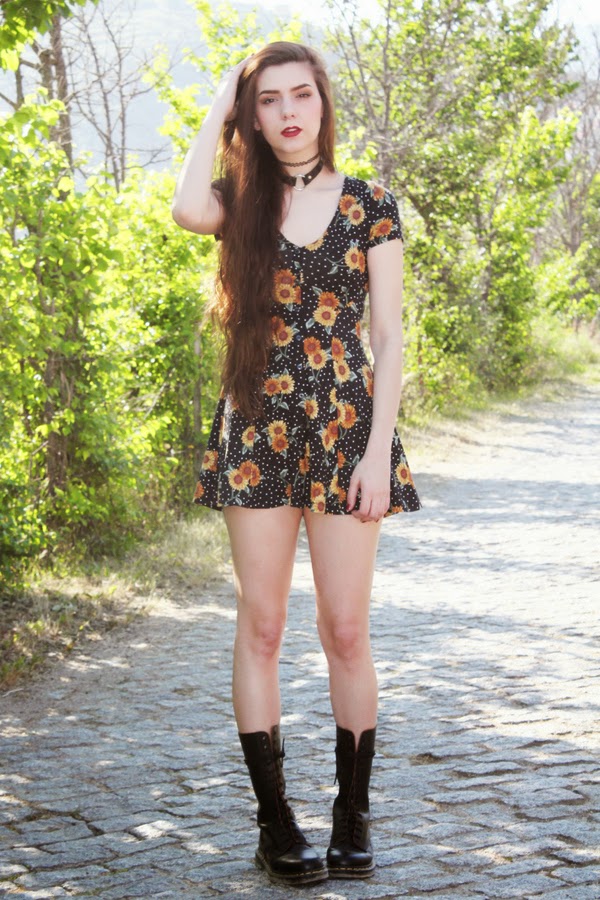 Hi, so here in my home town it wents from winter to summer, couldn't even had a dress like this on. Took this photos was so fun and so bad at the same time because in this place were lots of bumble bees and bees and any kind of flying bug, that i hate, have lots os photos running and screaming making ugly faces because i was terrified, i believe the dress helped the bee against me too, lol. Love sunflower print dresses, this one from Asos was really my favorite, had to match it with my Vintage 1914 Dr Martens that i never wear. Today is one of my closest friends birthday so i've got to go get ready for it. Hope you like this post.