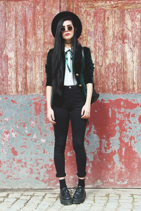Hi! This vintage green velvet blazer is one of my latest purchases, i love velvet is such a rich fabric, i love to keep looks simple and try to make the blazer the key of the look, added the ribbon (because i'm addicted you know) to accetuate the green of the blazer. I love to see this kind of dark velvet fabrics with gold so i added just a touch of gold to this look, you can see it in the sunglasses frame and on the little necklaces such as in the buttons of the blazer. I'm not using very dark lips lately, this time i'm wearing my dark burgundy lip pencil and i mixed it with a nude one to create a ombré effect darker in the lip line and getting lighter inside the lips. Hope you like this look :)