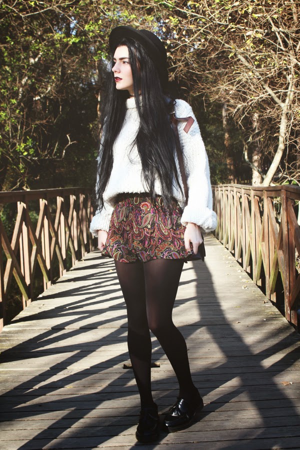 You all know how much i love Motel Rocks, talked about it lots of times, but i never mentioned how much i love Motel Vintage, the vintage section of Motel is so amazing, there you can find amazing decadent, whimsical fabrics the skirts in so many different plaids, lots of floral dresses, paisley playsuits, just like this one. This playsuit is so gorgeous love this mix of colors that look so good in dark looks, the fabric is the most light fabric i've ever seen, will wear it so much in summer 'cause is so fresh, that's why i made this combo with a very chunky sweater, because i love the opposite fabrics and to keep me warm. I almost look like a sheep in the chunky sweater, i love it so much, this jumper is a long one, but i put elastic in the bottom and now i can wear it down or put it up, looking like a crop top. I haven't take any photos showing the playsuit totally because the weather i so cold, but you can see it and buy it here. Hope you like this look.
