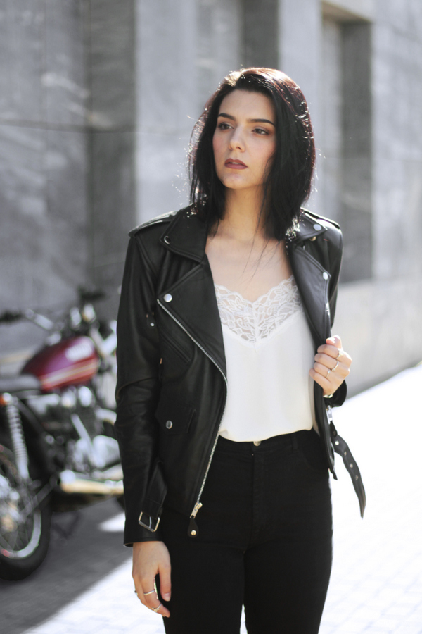 Here i'm wearing a classic combination of colors: black and white and what i really like is to mix different fabrics and almost contradictory pieces of clothes like a light soft romantic lace white top, so pure and so delicate with a rough leather biker.