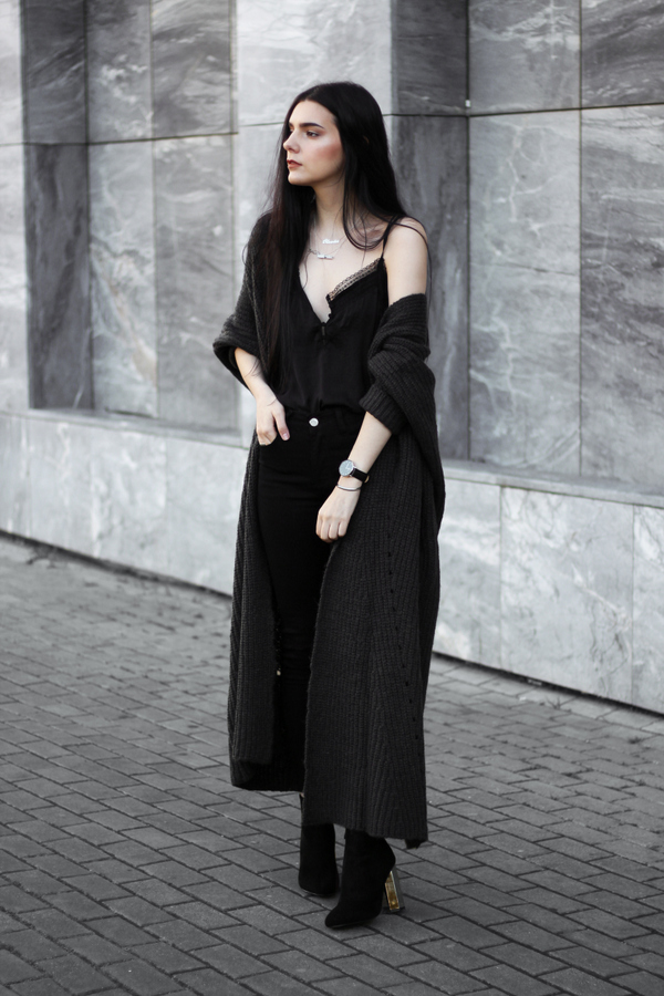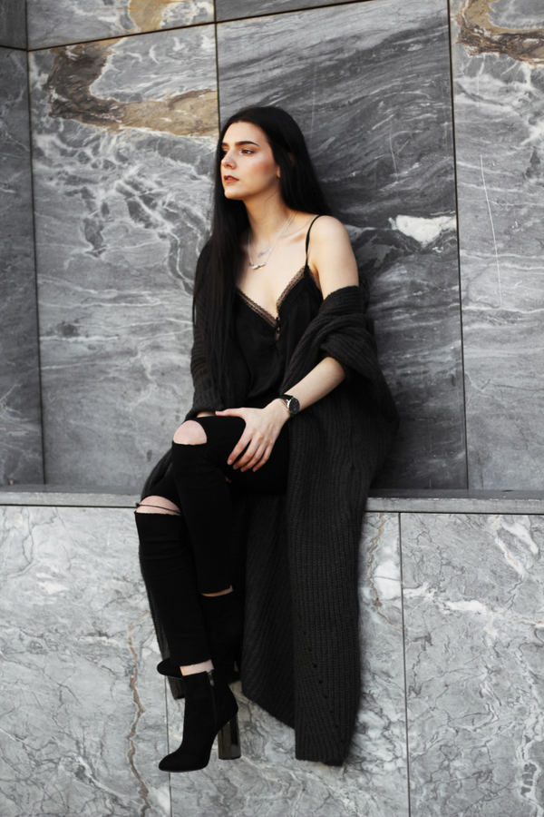 My favorite way to wear a cardigan is either with black silk/lace or with a simple oversized white t-shirt, here i'm wearing the chicest version with the silk and lace, and a simple pair of ripped black jeans. Both top and jeans are from Modatoi and you can find the top here, and the jeans here.