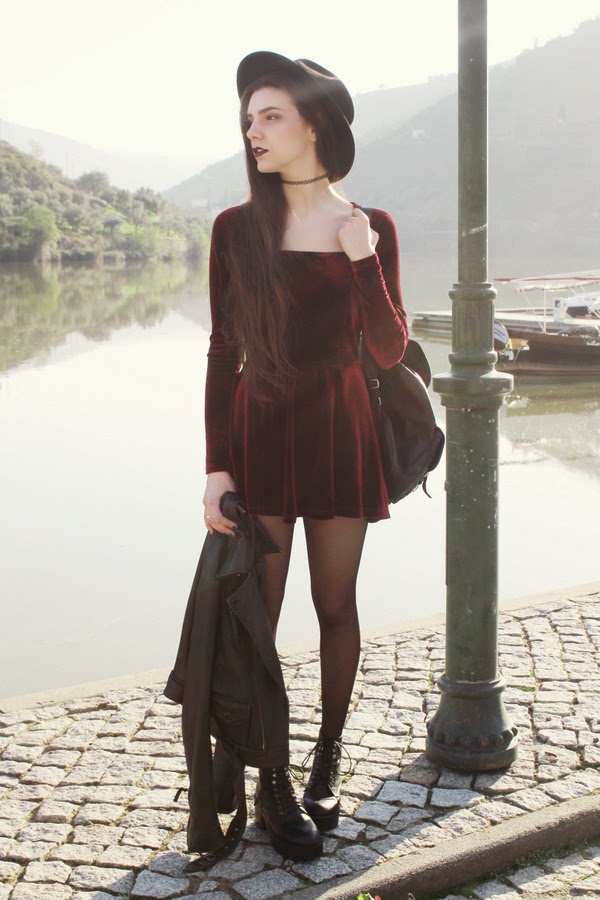 Hi! Took this photos one day walking around Pinhão, one of the first warm days near spring. The river was dirty because all the rainy days of this winter. The outfit couldn't be more basic for me, so easy to put together a burgundy velvet dress and all black everything. I'm not sure if i like this photos or not, but what a hell, just posted them :) Hope you guys like it.