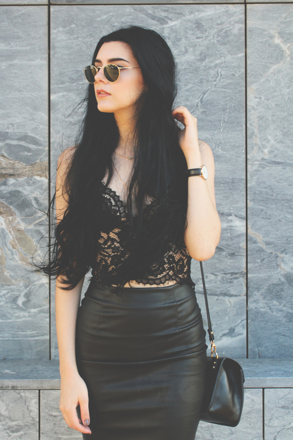 Lace, leather and white sneakers. I really like to wear chic pieces like this delicate lace top (my favorite top ever) and bodycon skirts with sneakers. The white sneakers really break the lady like look. This look is almost head to toe from Style Moi: the top, the skirt and the necklace are. This is the top i wear the most, because it's so cute and delicate i love to wear it with lots of different things, with black jeans and chunky boots, with a pencil skirt like this, with a romantic floaty maxi or midi skirt and stilettos. You can find the top here. This skirt is also from Style Moi and it's so cool, you can find it here. This necklace has 3 layers but i took of the pearl part layer and stayed only with this two more minimal parts, you can find it here. Hope you like this look.