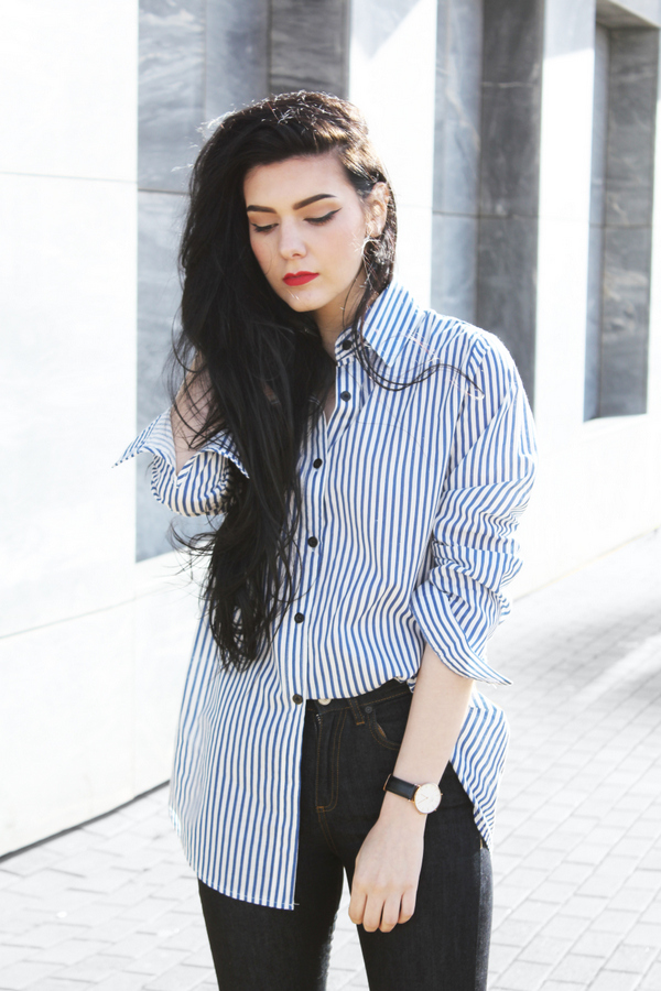 This is definitely one of my latest favorite looks. I always loved to mix different styles, and here i'm wearing a casual, even masculine stripped shirt, with the most feminie of the shoes, red shoes are always such a strong and statement women shoe. To make it even more casual i'm wearing a dark wash denim jeans, if i change the shoes for a pair of sneakers the vibe of the look would be totally different. The shirt looks that i borrowed from my baes closet, but it's actually brand new, it's from SheIn and i'm so in love with it, it's the perfect shirt i decided to choose size L for a loose fit and i'm loving it! The quality is also amazing. You can find the shirt here.