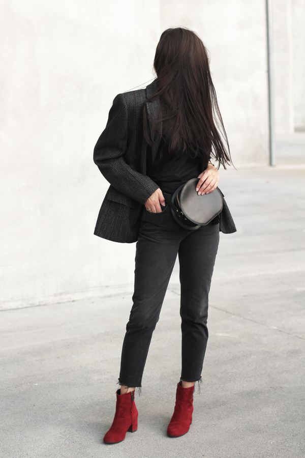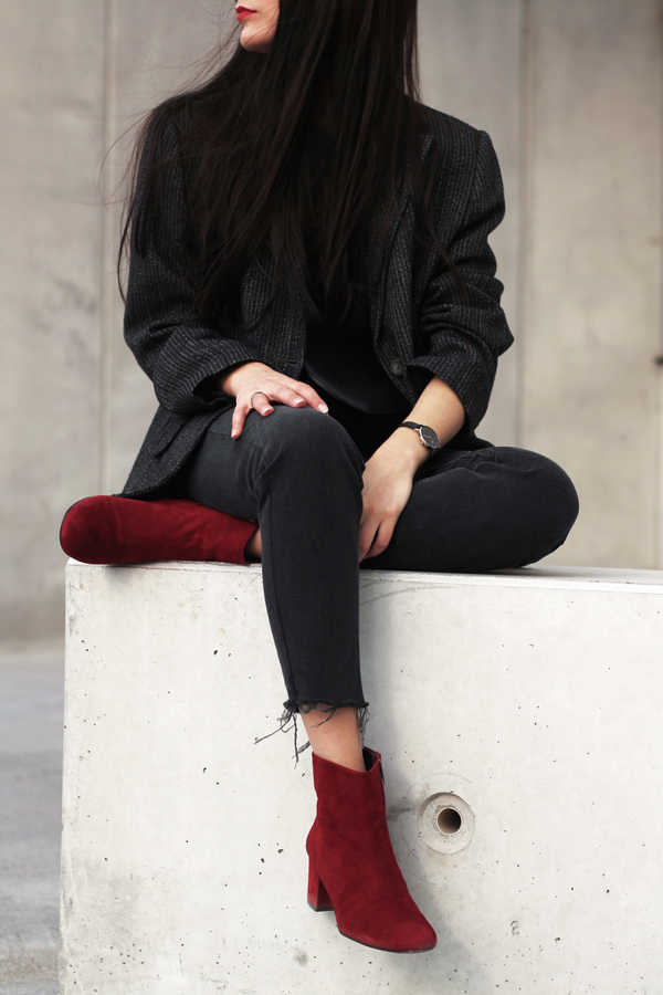 In this outfit the boots are matching a very thin stripe on my vintage blazer, i think you can't really see it on the photos tho, i love to add a pop os color to black looks, but i also like to have different "shades" of black, i think the look turn out much more interesting if there is a faded black piece, like my jeans here, or a really dark grey detail like the blazer, and also prints and textures are so so important, here the fabric of the blazer as some texture and a very discrete stripes print in white and red.